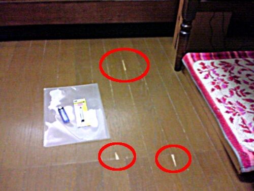 こんなかんじで、フローリングの表面がはげてます。 傷、拡大。 で、これで補修していきます。 『かくれん棒フローリング用 ダークオーク 358円(ナフコ)』 (製品紹介のページ) http://www.kentomo.co.jp/flooring/flooring2.html ※はじめはページ下部の『ね…